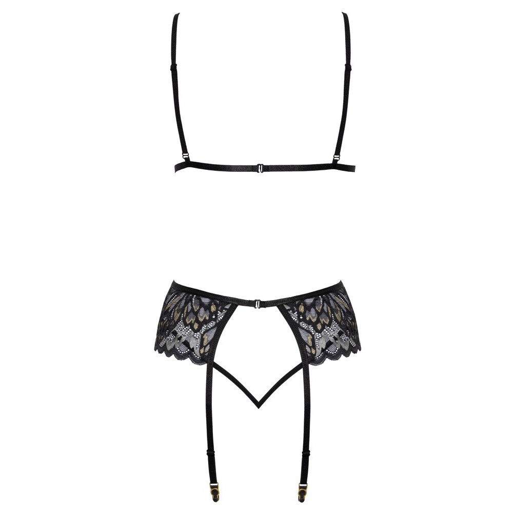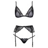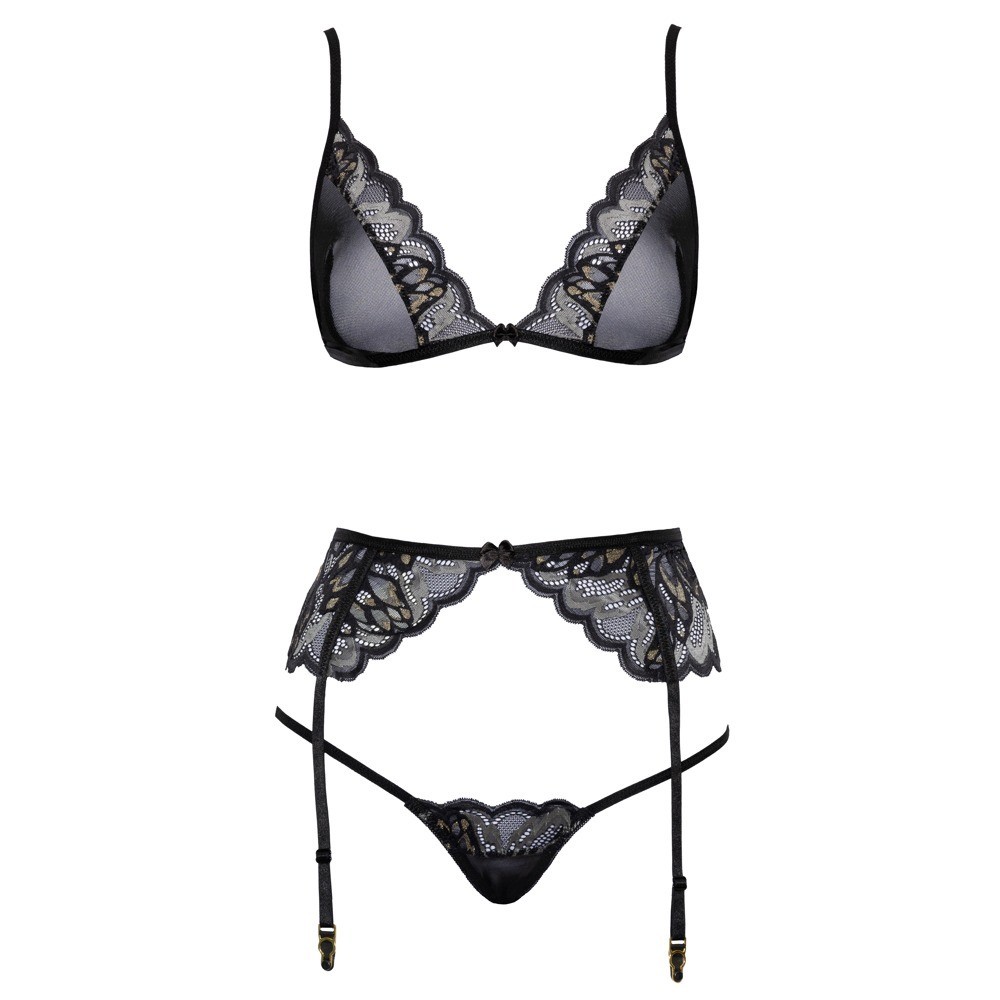 Set von Kissable, bestehend aus einem Bügel-BH, einem Strumpfgürtel und einem String, gefertigt aus zarter Spitze und Powernet. Alle Teile sind weich und elastisch und garantieren einen äußerst bequemen Sitz. Der BH verfügt über verstellbare Träger und einen Hakenverschluss am Rücken. Der Strumpfgürtel hat ebenfalls einen Hakenverschluss am Rücken und verstellbare Strumpfhalter. Der Tanga mit gewagtem Design besticht durch zwei schmale, elastische Bänder, die sich vorne treffen.
