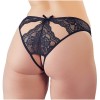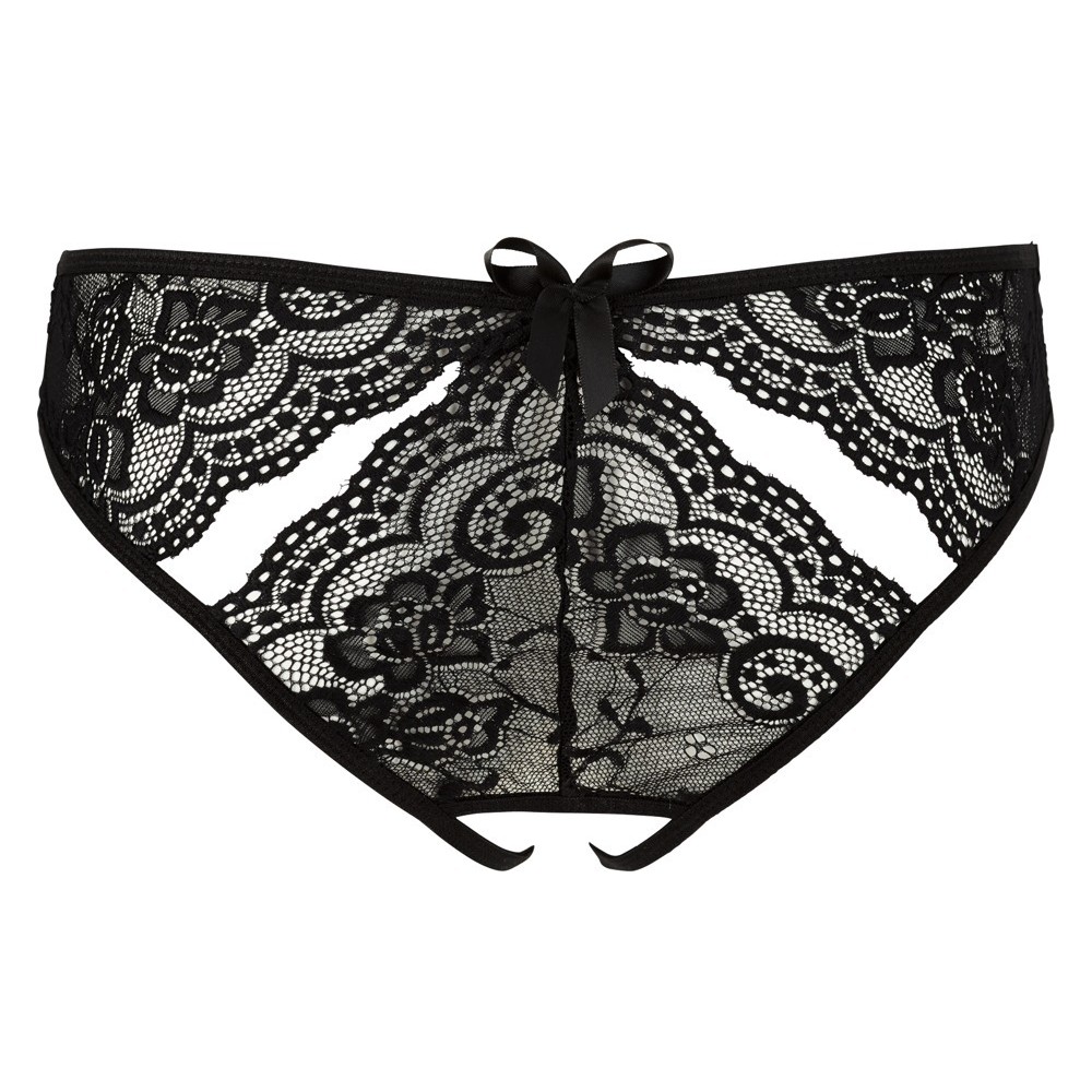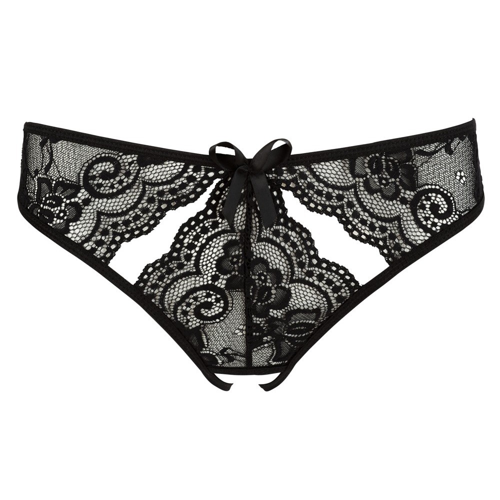Diese schwarzen Spitzenunterhosen zeichnen sich durch ihren gewagten Stil ohne Schritt sowie durch die zarten kleinen Ausschnitte vorne und hinten aus, die ihnen einen verführerischen und raffinierten Touch verleihen. Ein provokantes Modell, das die weiblichen Kurven charmant zur Geltung bringt.