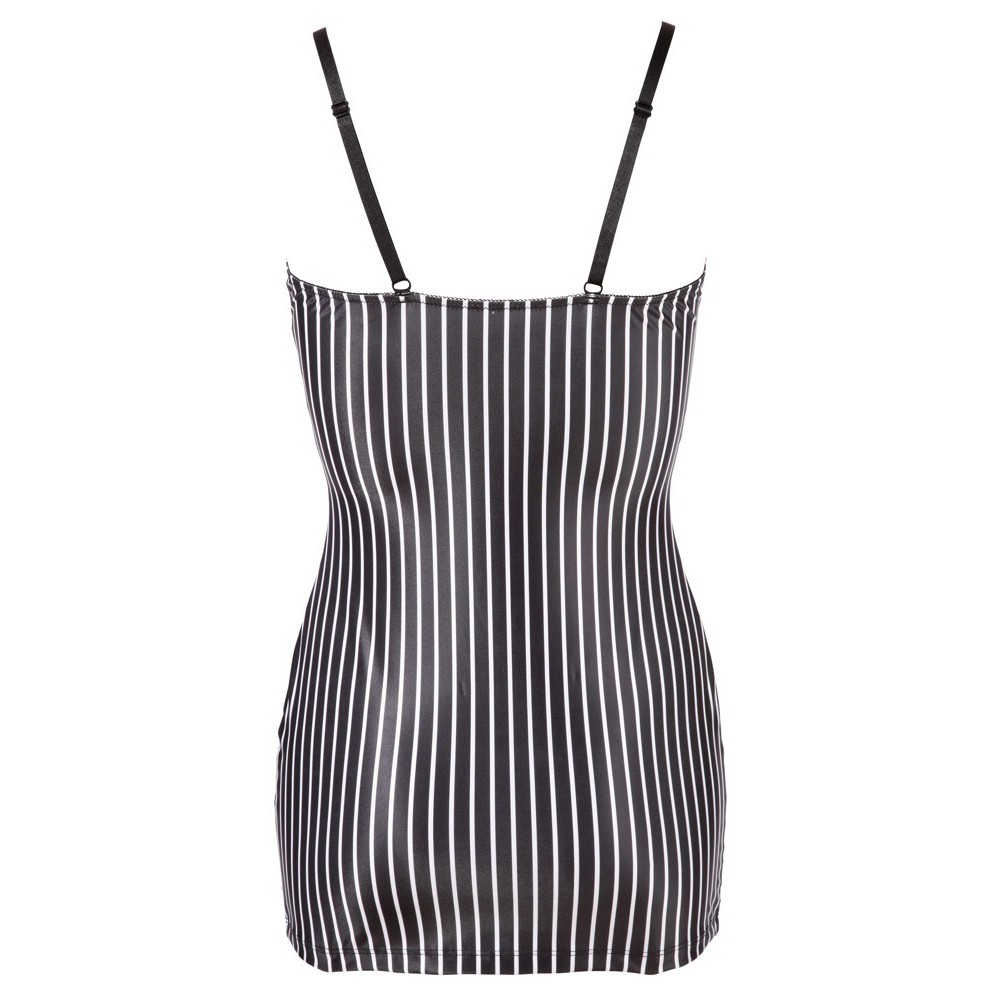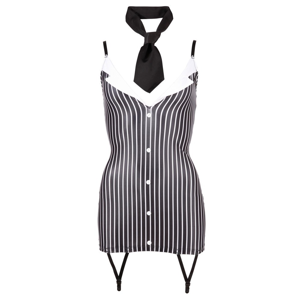 Vestido justo com alças ajustáveis e dois suspensórios à frente. Botões decorativos à frente e uma ligeira gola à volta da zona do decote. Gravata incluída.