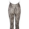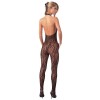 Schwarzer Catsuit aus zartem Netzstoff mit Neckholder-Design, das den Ausschnitt betont, verziert mit drei eleganten Perlen. Ohne Schritt und mit integrierten Füßen vereint er Sinnlichkeit und Komfort in einem einzigartigen, figurbetonten Kleidungsstück.