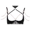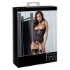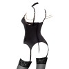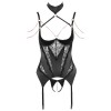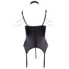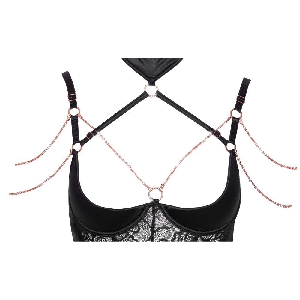 Korsett mit String von Abierta Fina, gefertigt aus elastischem Satin mit eleganten Spitzeneinsätzen und Details in Roségold. Der integrierte Bügel-BH mit leicht gepolsterten Cups betont die Brust und bringt sie besonders zur Geltung. Die beiden verstellbaren Träger am Ausschnitt sind mit den BH-Trägern und dem Halsband verbunden und sorgen für einen raffinierten und originellen Look. Das Halsband verfügt über einen Haken- und Ösenverschluss. Die dekorativen Strassketten, die über Brust und Schultern verlaufen, sind dank Druckknöpfen abnehmbar. Zum Set gehört außerdem ein String aus elastischem Satin ohne Schritt, mit einer abnehmbaren Zierkette im Schrittbereich.