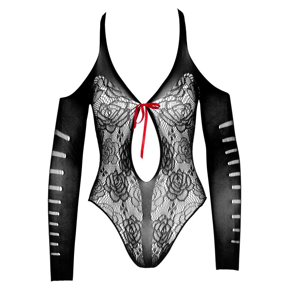 Extrem weicher, beinfreier Body von NO:XQSE mit verführerischem Spitzen-Design. Er verfügt über lange Ärmel und Ausschnitte an den Schultern, die für einen gewagten und eleganten Look sorgen. Vorne tief ausgeschnitten, wird er von einer einzigen roten Schleife gehalten, die sich leicht öffnen lässt und einen provokanten Akzent setzt. Die sinnlichen Ausschnitte erstrecken sich vom Nacken bis zum unteren Rücken und betonen die Kurven des Körpers. Nahtlos und hochelastisch, garantiert er außergewöhnlichen Tragekomfort.