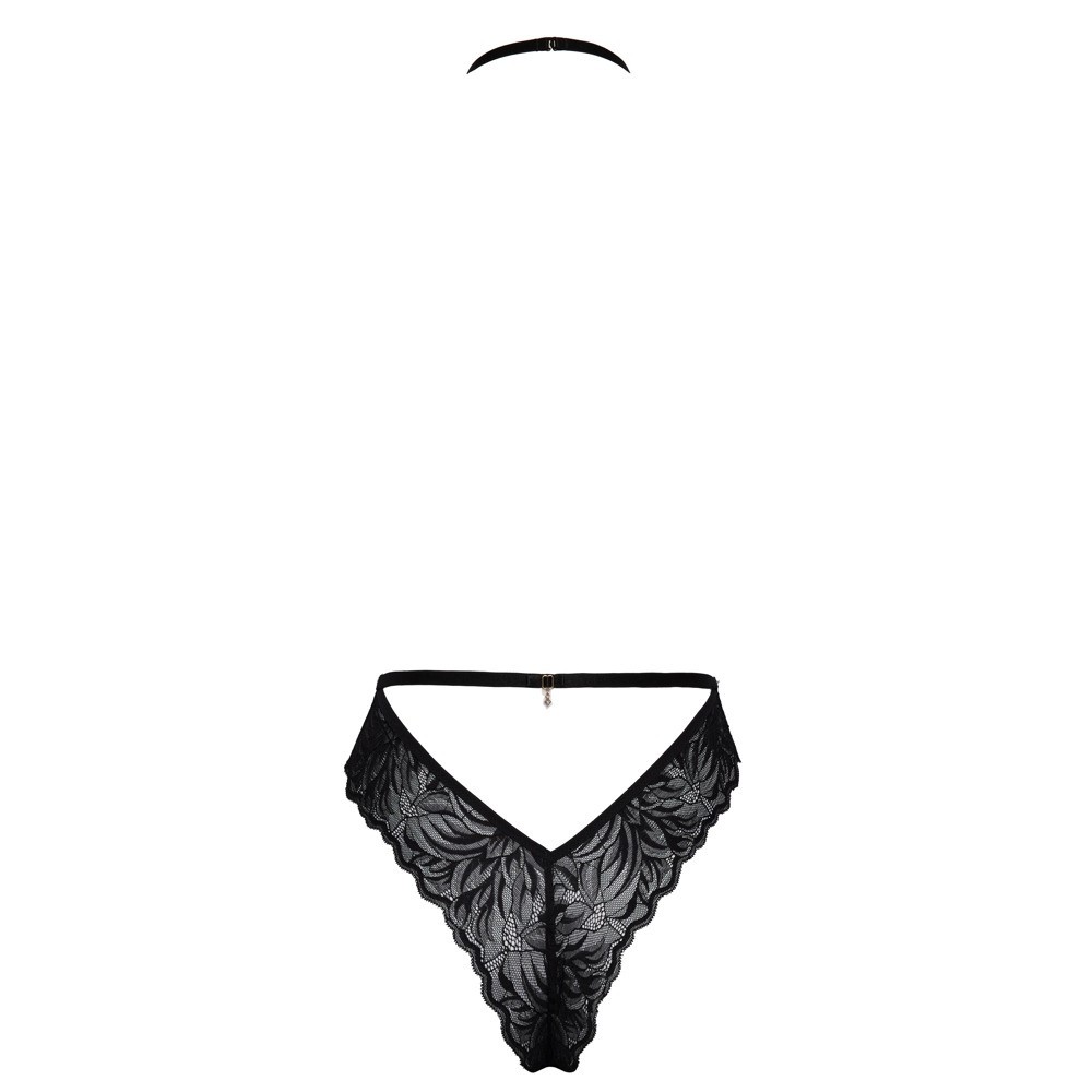 Verführerischer Body von Kissable, komplett aus feiner schwarzer Spitze. Weich und elastisch am ganzen Körper für höchsten Tragekomfort. Offener Rücken mit großem Ausschnitt vorne vom Hals bis zur Taille. Neckholder-Ausschnitt mit Schleife und glitzernden Steinchen vorne, mit kleinem Hakenverschluss am Hals. Taille mit Schleife und Verzierung aus glitzernden Strasssteinen am Rücken, mit kleinem seitlichem Hakenverschluss.