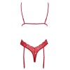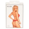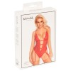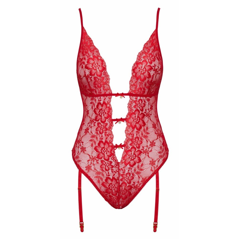 Verführerischer Body von Kissable, komplett aus feiner roter Spitze mit goldenen Details. Rundum weich und elastisch für maximalen Tragekomfort. Tiefer Ausschnitt bis zur Taille auf der Vorderseite, mit drei Bändern, die mit kleinen Schleifen und glitzernden Steinchen verziert sind. Auf der Rückseite Zweiteiler-Effekt (BH und String mit Strumpfhaltern). Kleiner Hakenverschluss am Rücken. Verstellbare Träger und Strumpfhalter.