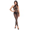 Eleganter, schulterfreier Catsuit von Noir mit langen Beinen. Komplett aus feinem, elastischem schwarzem Strick gefertigt, mit einem zarten Samtprint im Blumenmuster. Er schmiegt sich wie eine zweite Haut an den Körper an und sorgt für Komfort und einen verführerischen Effekt. Mit praktischem 3-Wege-Reißverschluss vom Kragen über den Schrittbereich bis zum Rücken.