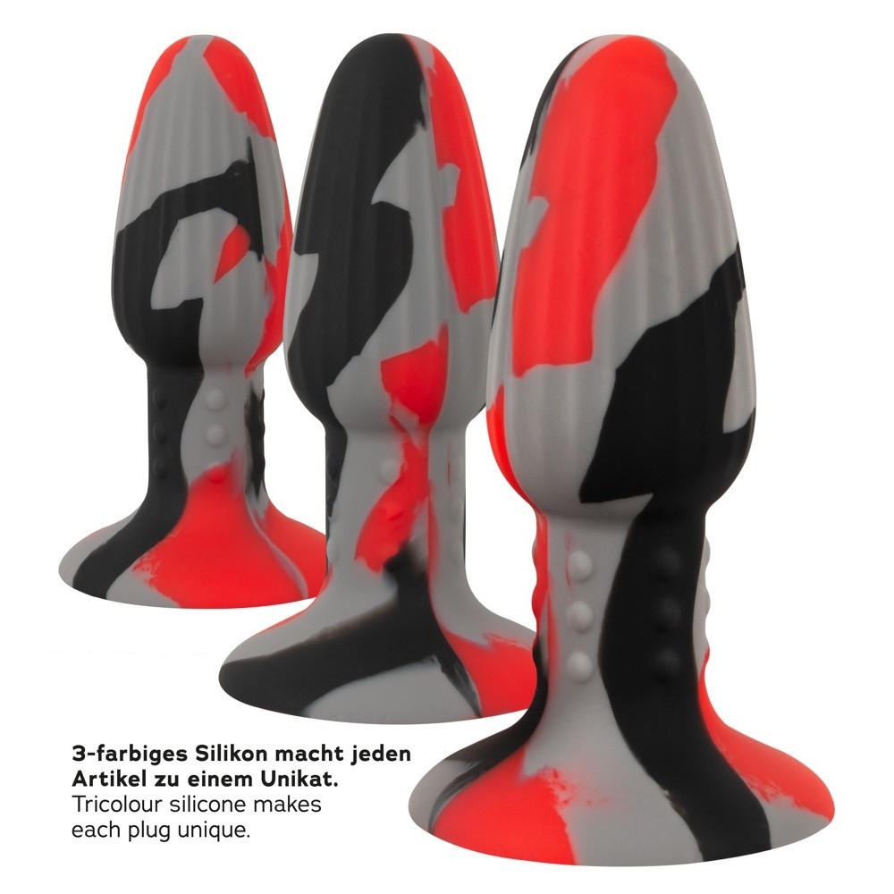 Der farbenfrohe Dreifach-Analplug mit Saugnapf von ANOS bringt Schwung in Ihre analen Spielchen! Jeder Plug wird von Hand in drei Farben geformt und ist somit optisch einzigartig und sieht exklusiv aus. Sein elegantes Design präsentiert sich in einer klassischen konischen Form mit einer schmalen Spitze für ein einfaches und bequemes Einführen sowie ausgeprägten Rillen und Noppen am Hals, die für intensive Stimulation und hervorragenden Halt sorgen.