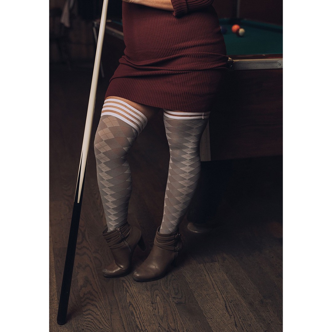 Kix'ies Golf Collection Thigh-High Stockings. Add a little bit of extra flair to your golf outfits with the help of our argyle print, thigh-high stockings!Kix'ies thigh highs are designed for all-day wear, with a no-slip-grip. Available in Petite to Plus Sizes. Kix'ies are the #1 thigh-highs that actually stay up! Sizing: Measure by height first and thigh circumference second. Weight can be arbitrary when sizing for a thigh-high. We all carry our weight differently be it in the tush, tummy or thighs  which have no bearing on finding the perfect Kix'ies® fit!