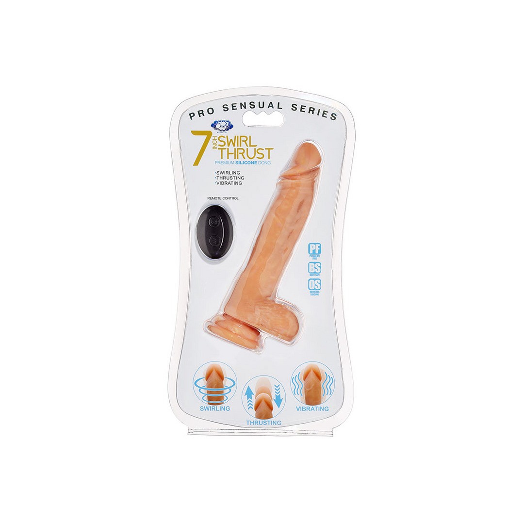 O vibrador Pro Sensual 7 Swirl Thrust possui dois motores potentes, oferecendo 7 funções de vibração e 7 funções excitantes de impulsão e rotação.