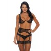 Conjunto de 3 peças com sutiã em V, cinto de ligas e tanga em malha e renda delicada.