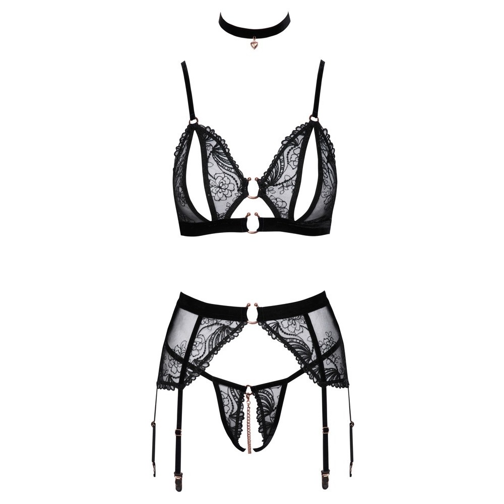 Der BH verfügt über Ausschnitte an den Cups, einen Hakenverschluss am Rücken und verstellbare Träger aus Samt. Der Strumpfgürtel hat einen Verschluss am Rücken und 6 verstellbare Strumpfhalter aus Samt. Der String besticht durch den offenen Schritt und die aufregende Kette, die für mehr Vielseitigkeit abnehmbar ist. Das Samthalsband verfügt über einen zarten Anhänger in Herzform und ist mittels Hakenverschluss und Band verstellbar.
