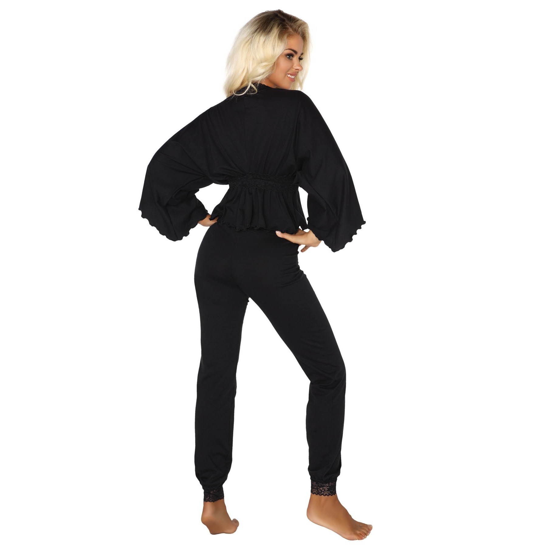 The Margot set is a two-piece sexy outfit made of soft-touch cotton and elegant lace. The short top, fancily cut, with wide sleeves, coquettishly reveals the waist, adding feminine charm to the whole. Long, comfortable pants finished with a lace hem and tied at the top with a drawstring provide comfort and elegance. The perfect choice for an evening full of relaxation and elegance.