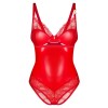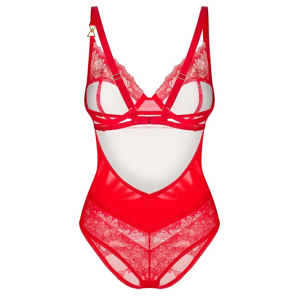 O body Aliosa da Obsessive tem um estilo sedutor e uma cor vermelha sensual - é feito de um belo material brilhante e liso e de uma delicada renda floral transparente. É também macio e elástico para um ajuste muito confortável. Há um discreto pormenor decorativo dourado entre as copas com aros e numa das alças do sutiã. As alças, o fecho de gancho na zona das virilhas e o fecho de gancho nas costas podem ser ajustados à medida.