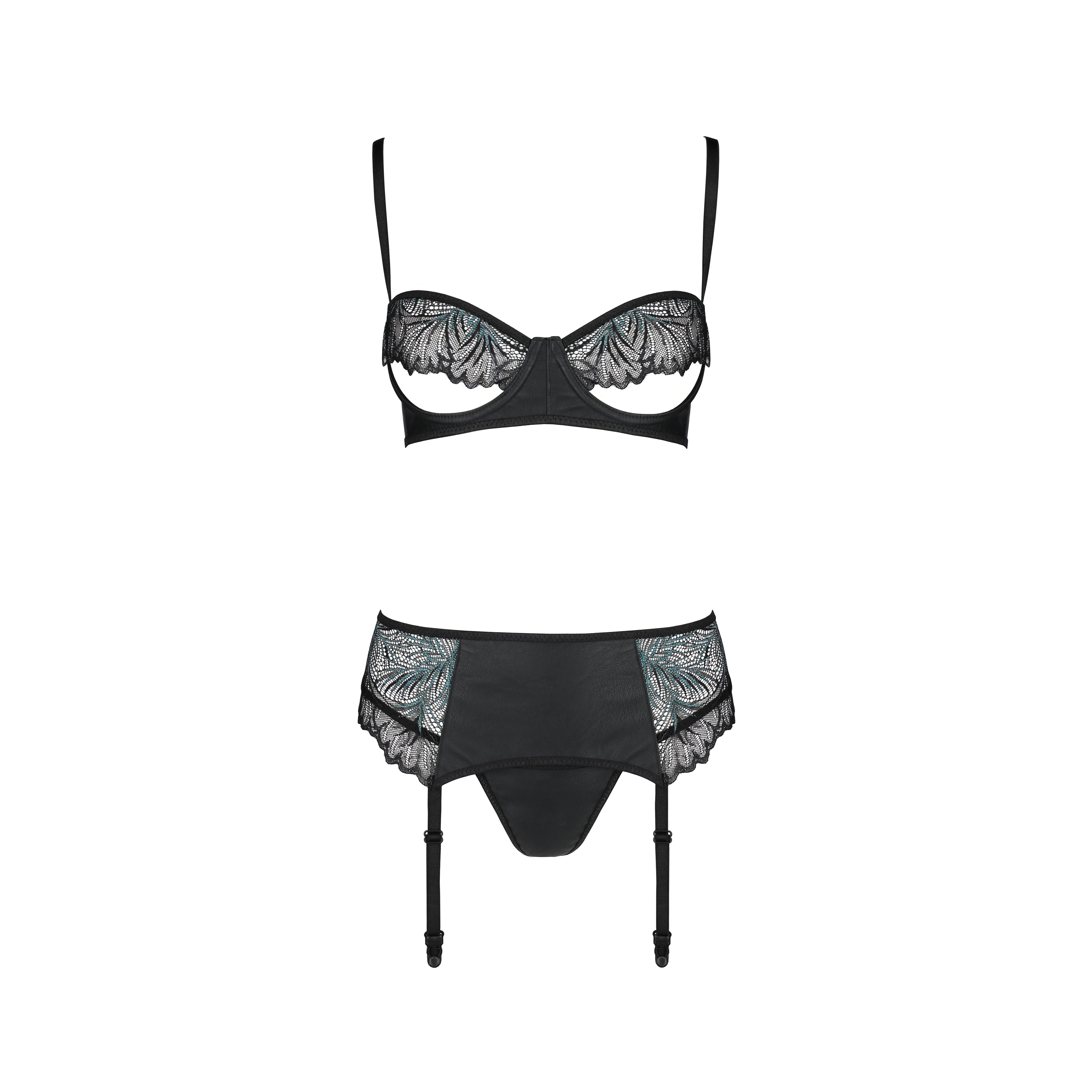 The Astrida set is a seductive combination of bra, thong and garter belt, with black lace and green details, for an evening of sophistication and elegance.