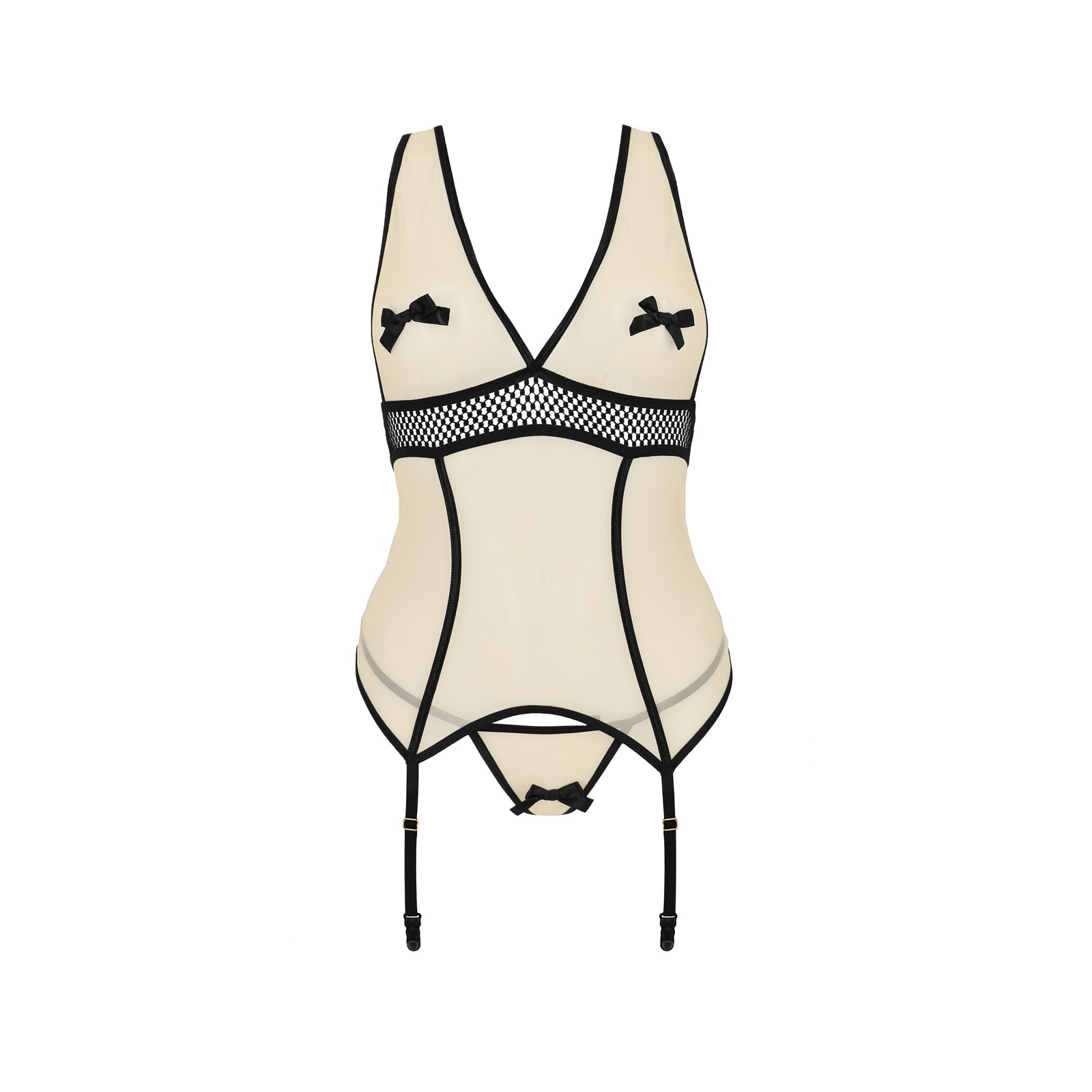 Corpete sedutor que modela perfeitamente a cintura e o busto. Inserções em forma de laço extremamente românticas e tule delicado. Uma combinação perfeita que despertará os seus sentidos.