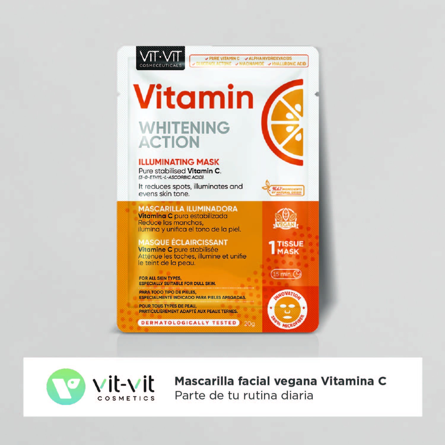 O segredo está no ácido 3-O-etil ascórbico, um derivado altamente estável da vitamina C que, quando utilizado nesta máscara, penetra nas camadas mais profundas da pele para ajudar a clarear o tom e a reduzir as descolorações visíveis.