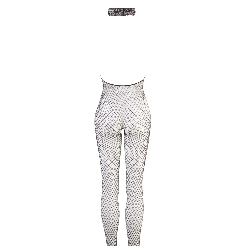 Exciting black fishnet bodystocking with lace collar and open crotch for spontaneous sex action. Smooth and slim-fitting top quality. 88% polyamide, 12% spandex.