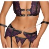 The Cottelli BONDAGE set features a corset with a garter belt, a crotchless thong and 2 matching wrist cuffs. This 3-piece set, crafted from soft, stretchy purple floral lace, seduces with a matte black finish and silver metal details for a bondage-inspired look. The look is completed by the two soft wrist cuffs included, which can be attached to the side rings of the suspender belt using their hook chains. The bodice, open at the front, is joined at the centre by decorative rings. The lace back features a deep V-shaped cut-out. The garter belt also has a ring at the front of the waist and a hook-and-eye fastening at the back. The 6 garter straps are adjustable. The small lace thong is completely crotchless.