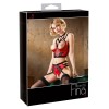 A sensual, slightly padded satin balconette bra with adjustable straps and an adjustable neckline. It features semi-sheer lace inserts and a decorative bow beneath the bust, complemented by a rhinestone ring. The waist-high thong matches the bra and features adjustable, removable suspender straps, secured around the hips by three elasticated bands. The set also features another rhinestone ring at the waist and semi-transparent lace inserts at the front and back.