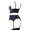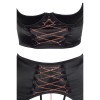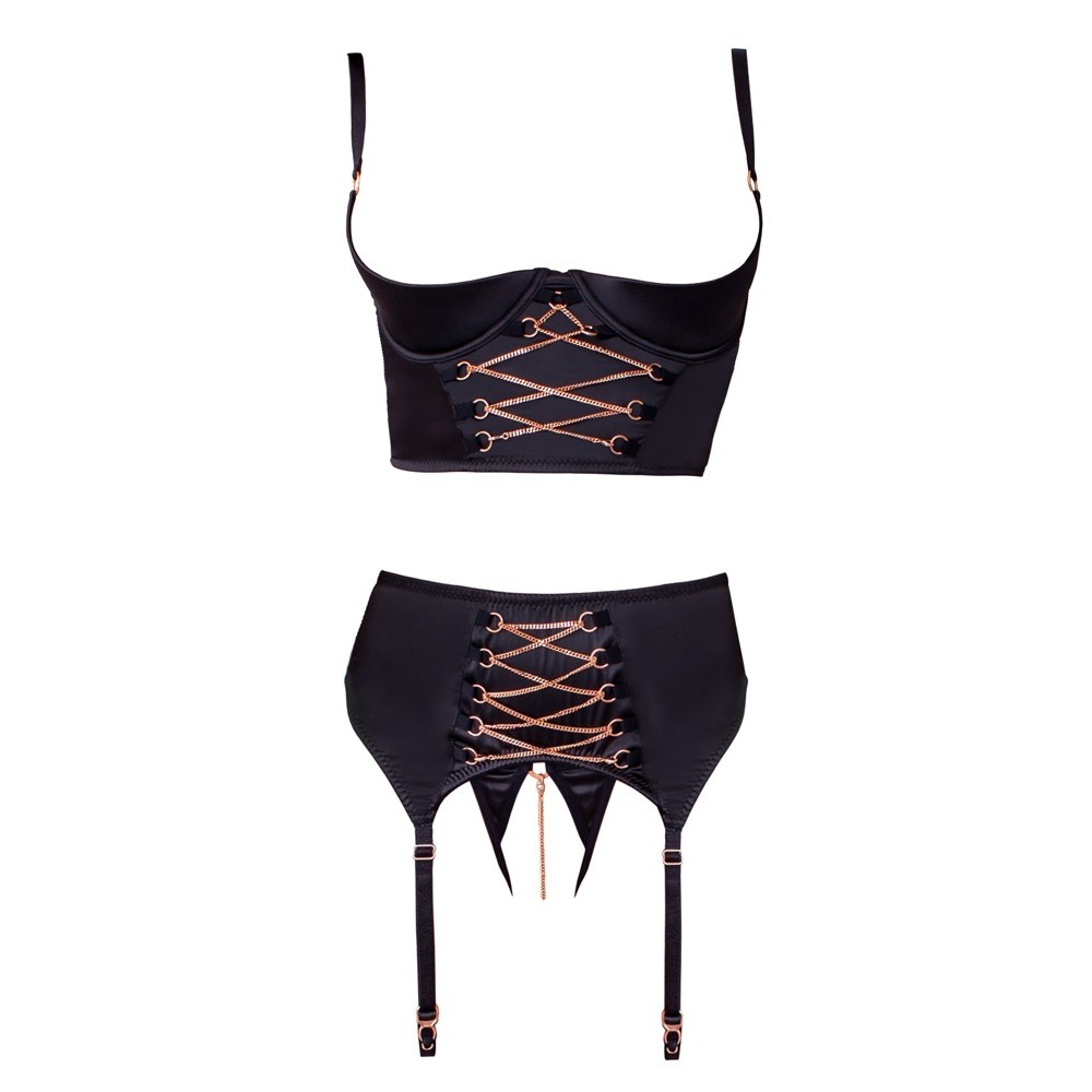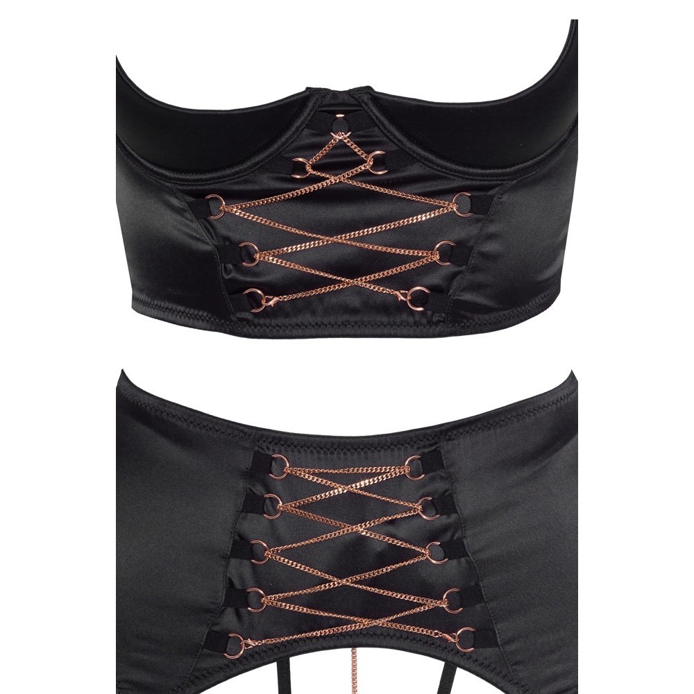 The Abierta Fina set comprises a slightly padded balconette bra, a garter belt and a thong, all in stretchy black satin with elegant rose gold-tone detailing. The underwired bra is longer, features a hook-and-eye fastening at the back and adjustable straps. The wide suspender belt also has a hook-and-eye fastening at the back and adjustable suspender straps. Both the bra and the belt feature small decorative chains with a bow effect at the front. The matching thong is completely open-crotch and includes a removable decorative chain in the crotch area.
