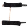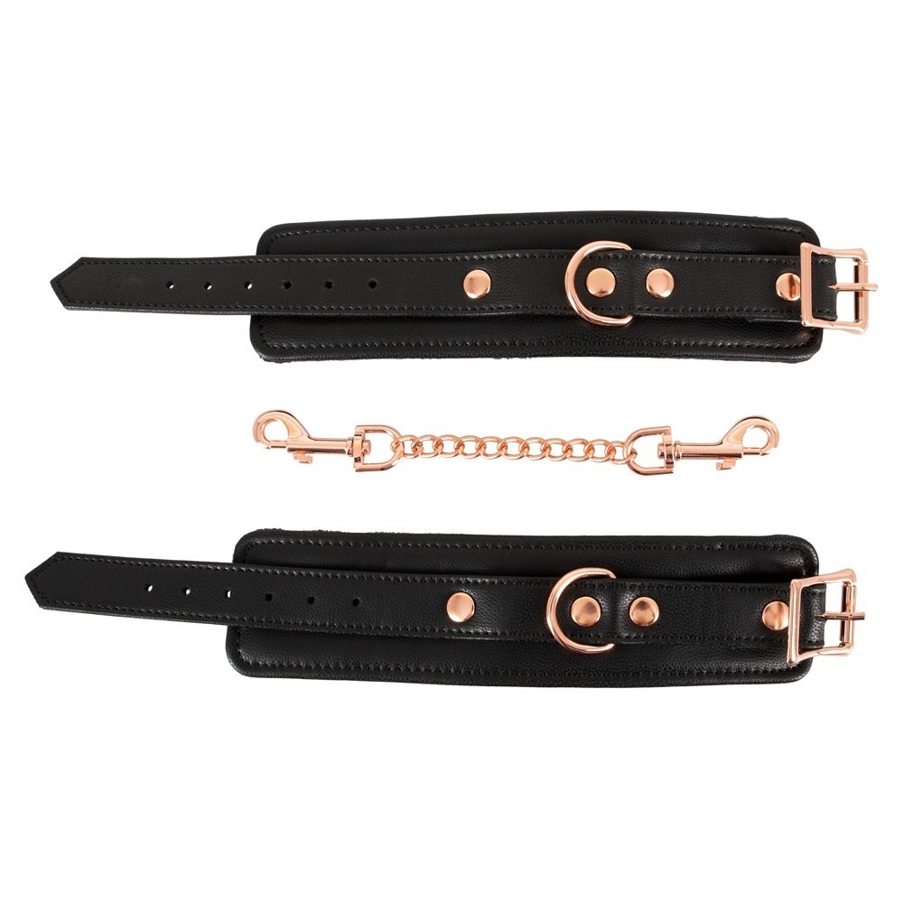 Sturdy handcuffs from Bad Kitty in a stylish leather look, featuring a connecting chain and rose gold-coloured metal details. The handcuffs are softly padded with plush fabric on the inside. Each cuff has a ring that allows the included connecting chain to be attached using snap hooks. The handcuffs can be adjusted from 15 to 21 cm using the buckle fastenings. The connecting chain with 2 snap hooks is 22 cm long.