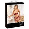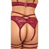 A seductive set from Abierta Fina comprising an open-cup bra and a thong with suspenders, without a gusset. The delicate dark red lace is accentuated by velvet straps and rose gold-tone accessories, creating a sophisticated and provocative look. The fabric is soft and stretchy, ensuring a comfortable fit.