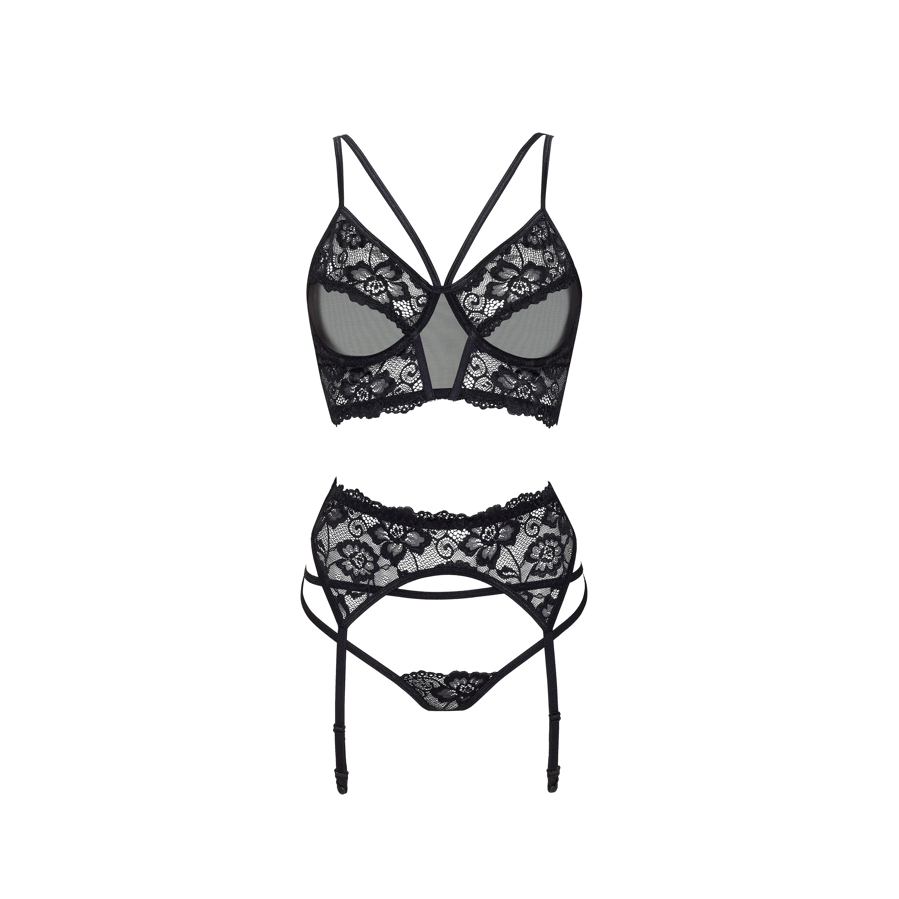 Discover the exquisite Ryanne Set, a perfect blend of elegance and sensuality that highlights your feminine beauty. This three-piece set, consisting of a bra, garter belt, and panties, is made from delicate black lace that perfectly complements the thin, decorative straps, creating a sophisticated and sexy look. The bra features underwire for excellent support and shaping, and adjustable straps for a perfect fit. The garter belt is equipped with adjustable straps and a hook-and-eye closure at the back.