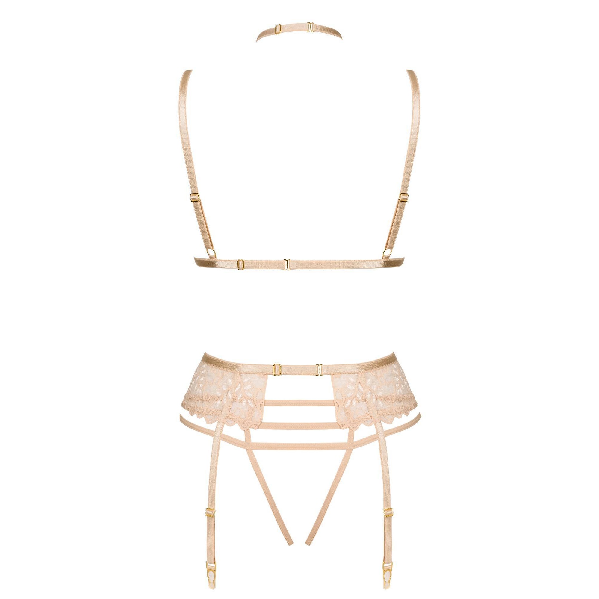 Discover the exceptional lingerie set Noemi set nude, consisting of a bra, thong, and garter belt, which will undoubtedly enchant both you and your partner. This sensual set, made of delicate lace fabric in a subtle nude color, accentuates your natural beauty and makes you feel incredibly feminine and sexy.