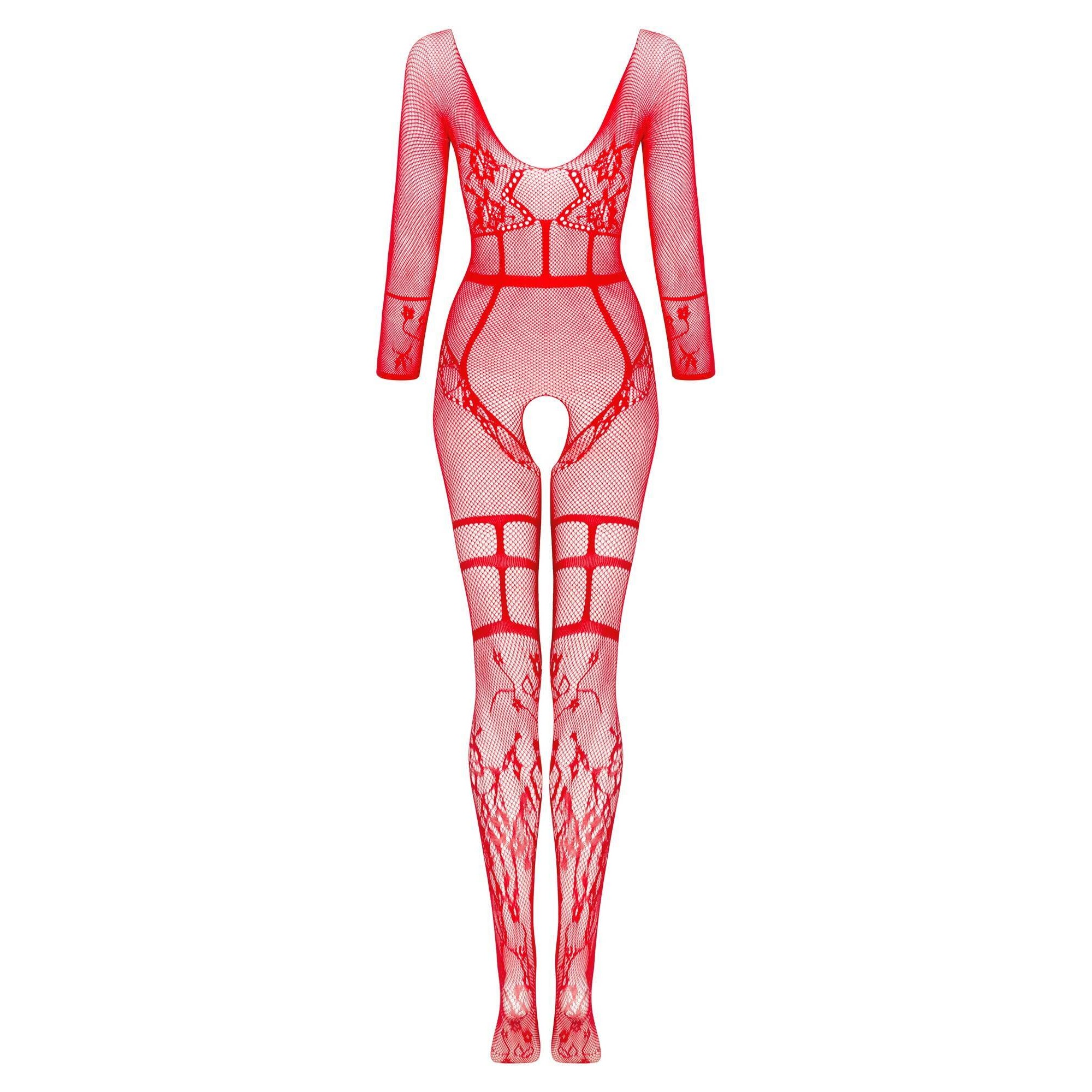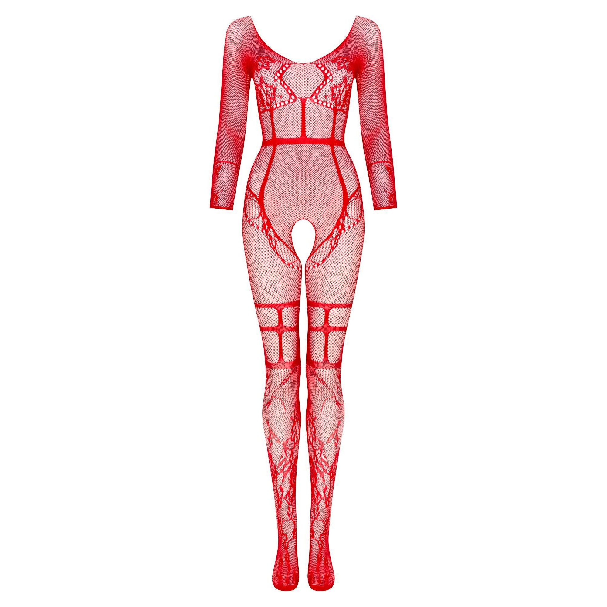 Super sexy bodystocking for lovers of comfortable underwear, made of red, delicate yarn. The fishnet motif is complemented by impressive floral applications and straps at the waist and thighs.