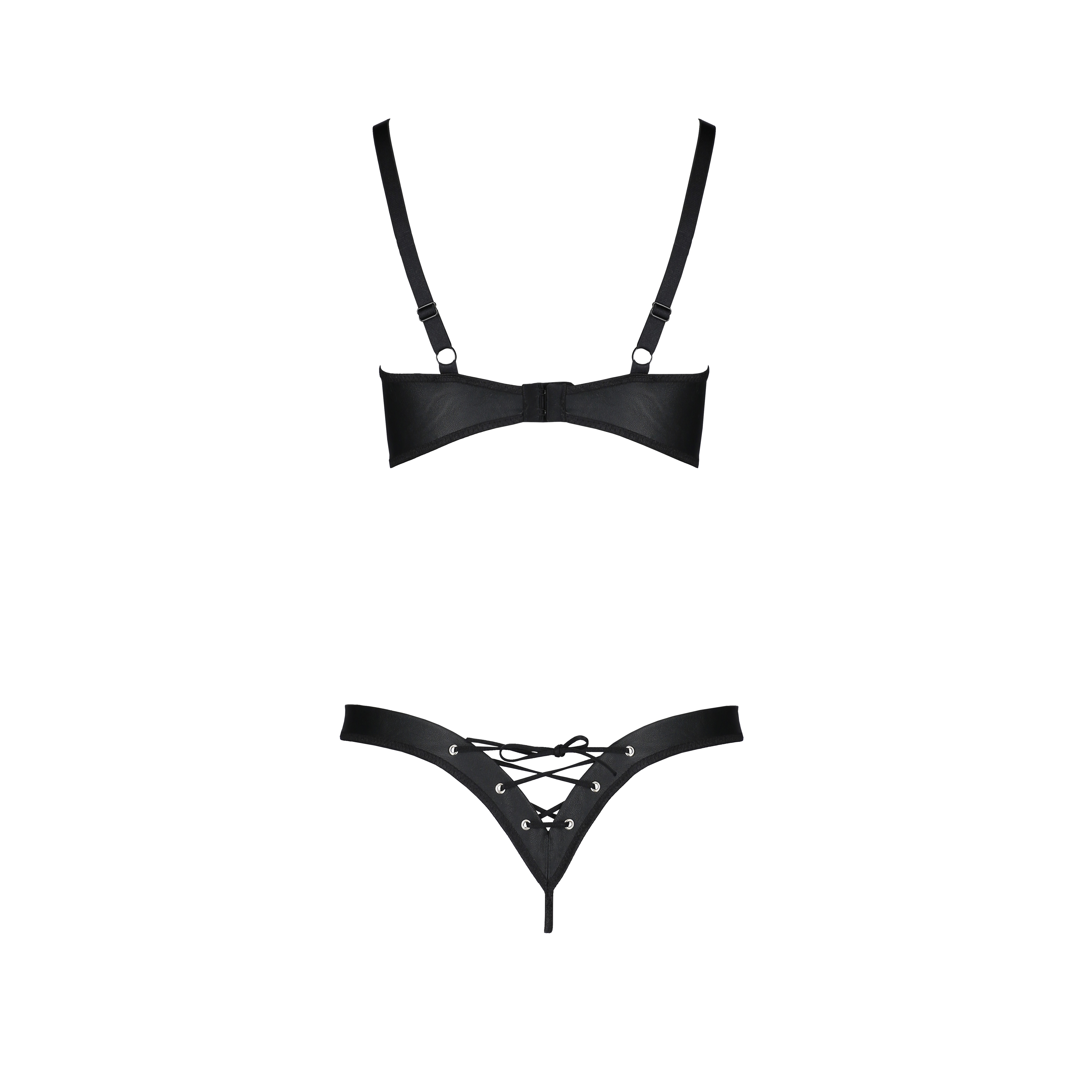 The open bra is structured with reinforced cups and underwire support, providing secure support and a perfect fit. The bold thong has adjustable ties on the sides, allowing for a personalised fit that enhances your curves.