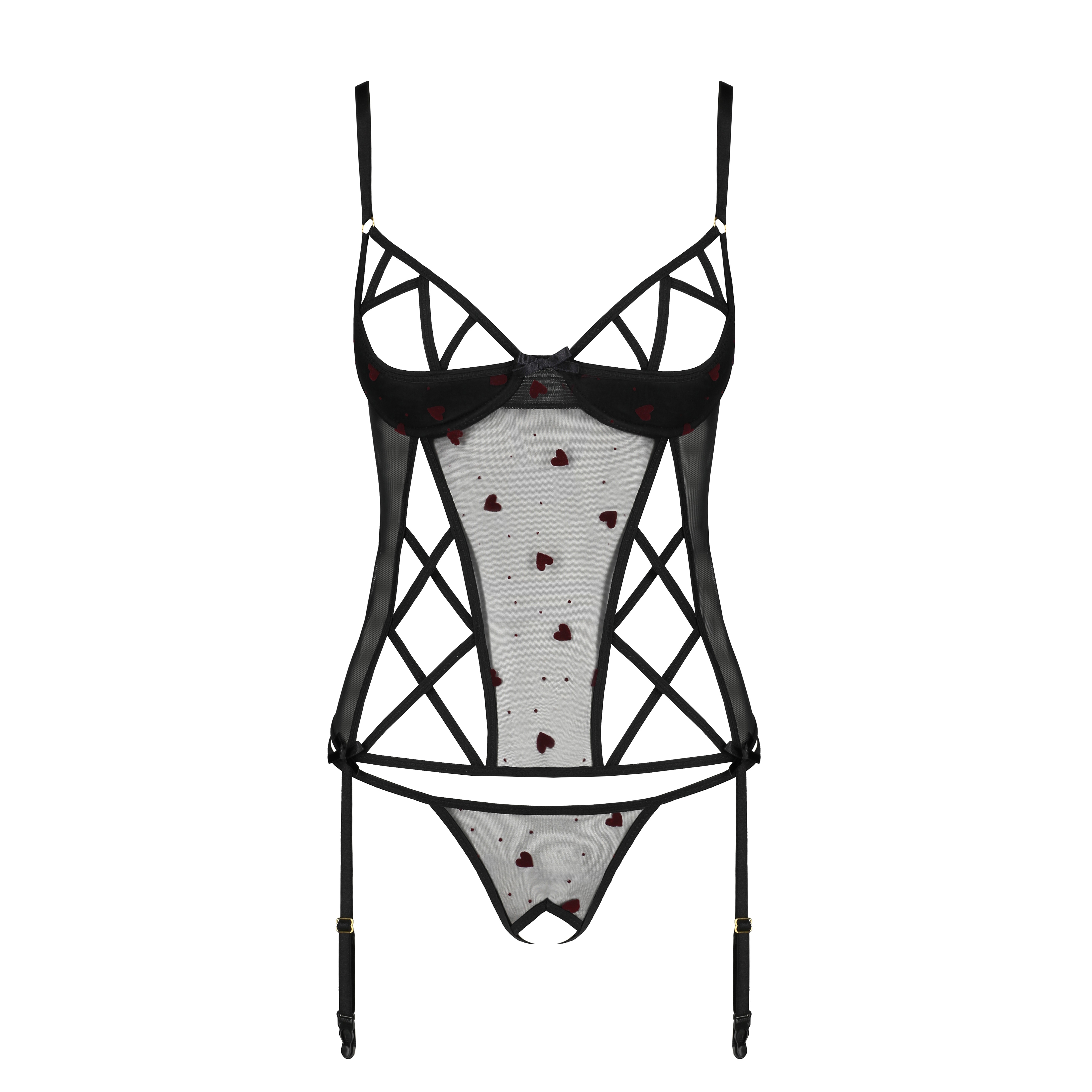 Made from heart-patterned tulle, this set is a perfect combination of romance and seduction.