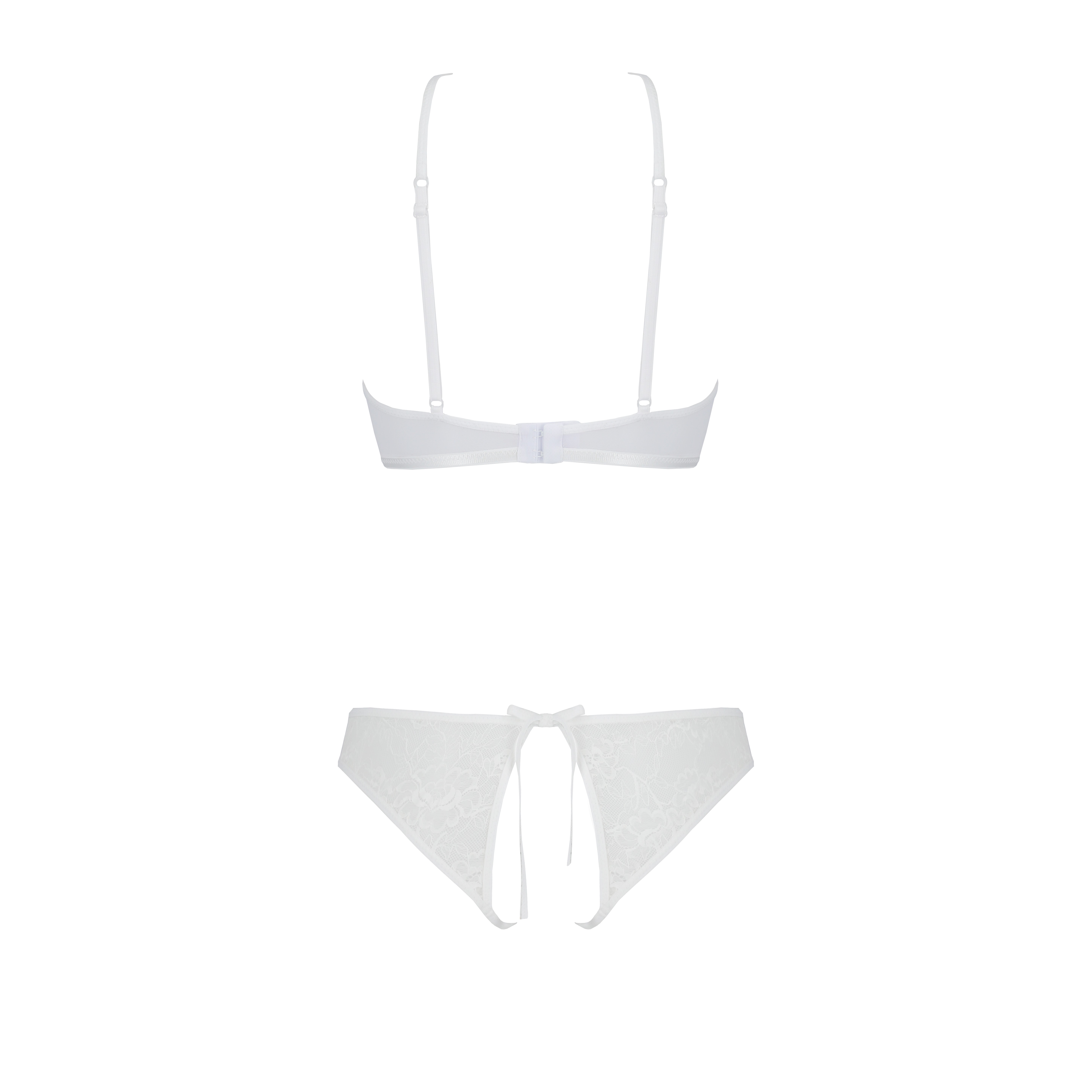 The bra, with delicate lace cups, emphasises the neckline, while the adjustable straps ensure a perfect, comfortable fit. The open thong between the legs emphasises feminine curves with lace details, adding a touch of sensuality and elegance.