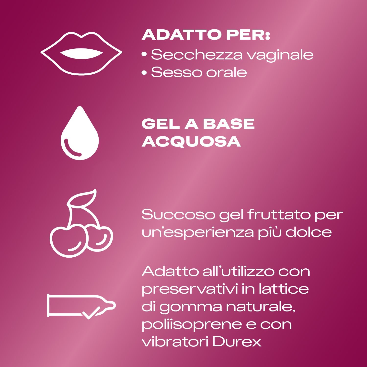 Este lubricante íntimo de Durex permite suavizar la sequedad vaginales. Apto para el uso con condones y con sabor de cereza para experiencias más sabrosas.