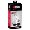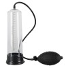 Bomba de pene transparente con funda negra (2 cm, flexibles) y práctica pera de bombeo. La escala graduada permite seguir visualmente el aumento conseguido. Incluye válvula de seguridad para controlar la presión.
