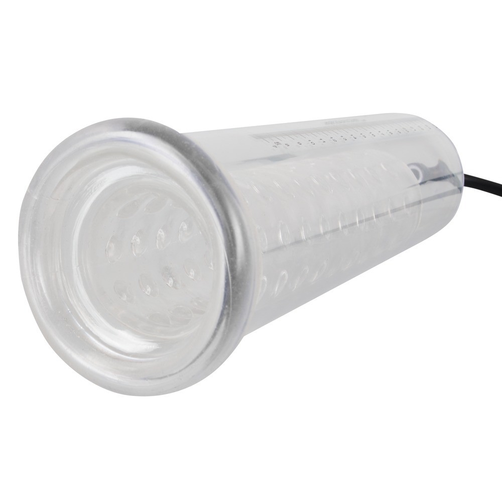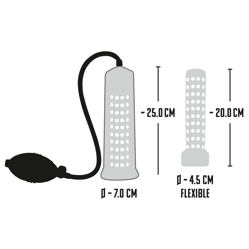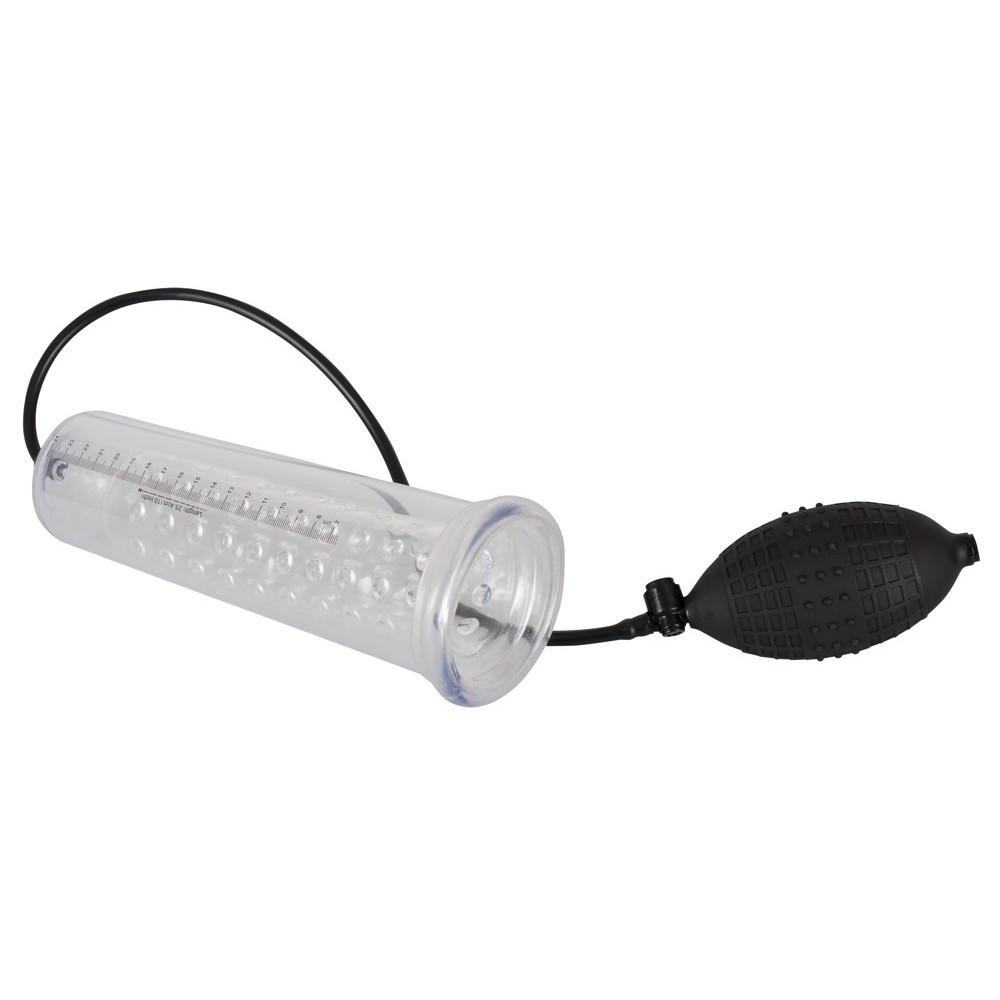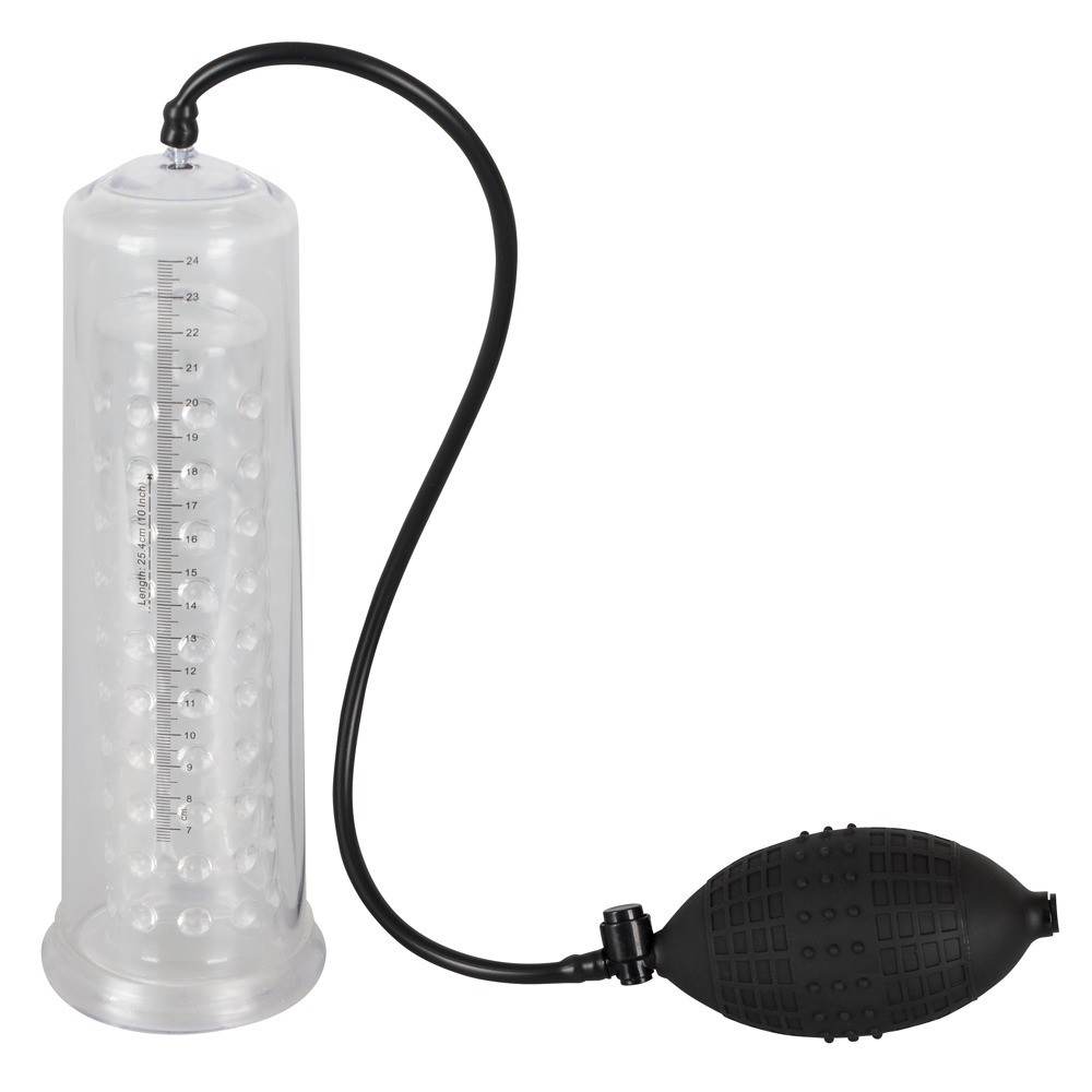 Bomba para el pene transparente con funda interiore en forma de botón (diámetro 4,5 cm, flexible, longitud aprox. 20 cm) y práctica bomba de bola. Puede seguir el éxito del aumento de su pene a través de la escala. Con válvula de seguridad de presión.