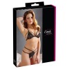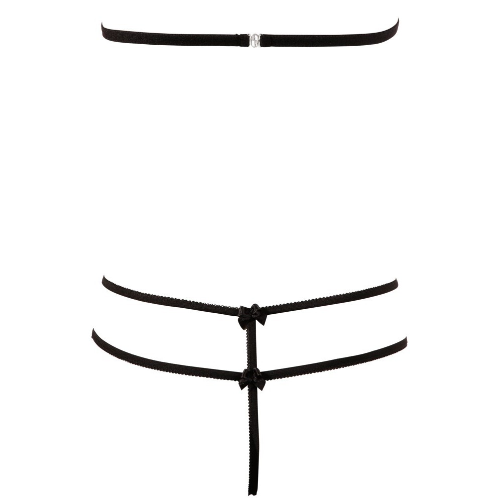 Este sensual conjunto despierta todos los deseos: un delicado sujetador sin aros, con escote halter, confeccionado en elegante encaje floral. Presenta detalles de tirantes y copas que se pueden doblar hacia abajo, creando un efecto aún más provocativo. El tanga a juego, sin entrepierna, incluye tirantes decorativos adicionales que le dan un aspecto extremadamente sensual y sofisticado.