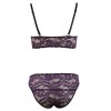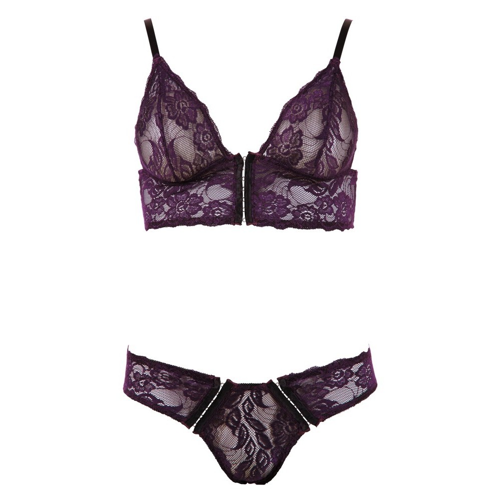 Sujetador con tirantes ajustables y cierre de corchetes en la parte delantera. Incluye tanga a juego. Ambas piezas están confeccionadas en encaje floral suave y elástico, lo que proporciona comodidad y elegancia.