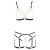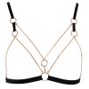 Sujetador sin aros y braguitas sin entrepierna de Cottelli LINGERIE, confeccionados en tiras de terciopelo elástico con cadenas y anillas en tono oro rosa. Las tangas tienen encaje elástico en la parte trasera. El sujetador tiene cierre de gancho en la espalda y tirantes ajustables para un ajuste perfecto. Incluye cadenas con ganchos a presión en el sujetador, algunas de ellas extraíbles. El tanga también cuenta con cadenas extraíbles con ganchos a presión. Las tiras ajustables para los muslos también se pueden quitar.