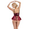 Sujetador con escote profundo con volantes y brillantes y tanga de encaje sin entrepierna, en un conjunto de Abierta Fina. El sujetador con escote profundo, confeccionado en material mate y delicado encaje, tiene copas con aros ligeramente acolchadas. Eleva y realza el pecho, enmarcándolo con cadenas en tono rosa dorado que lo convierten en el centro de atención. La zona de la cintura presenta un elegante efecto de cinturón, realzado por una gran hebilla con pedrería, mientras que las caderas se resaltan de forma sensual con volantes ligeros y ondulados.