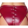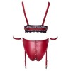 Sujetador, tanga y liguero de Cottelli BONDAGE confeccionados en elegante material rojo mate, con delicadas inserciones de encaje negro y detalles metálicos plateados. El seductor sujetador tiene copas con aberturas que se abren fácilmente mediante botones a presión. Los tirantes del sujetador y la tira bajo el busto son ajustables para un ajuste perfecto. El tanga con liguero también tiene botones a presión, que se pueden abrir desde la parte superior de la entrepierna hasta la parte superior de las nalgas. Hay anillas en los laterales y en la parte trasera, y los dos cierres incluidos (con gancho y anilla) se pueden fijar a estas anillas. Las tiras del cinturón de ligas son ajustables y se pueden quitar por completo.