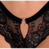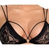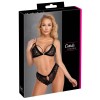 Conjunto de Cottelli LINGERIE compuesto por sujetador suave y tanga, en encaje negro elástico y suave, con elegantes tiras de terciopelo en el sujetador y en la cintura del tanga. El sujetador presenta un aro decorativo entre las copas, tirantes dobles elásticos en la parte delantera y tirantes ajustables en la parte trasera, además de cierre de corchete en la espalda. El tanga destaca por su pequeño corte delantero con anilla decorativa en la cintura y por un delicado hilo de perlas negras cosido en la zona íntima, para una sensación sutilmente estimulante con cada movimiento.