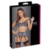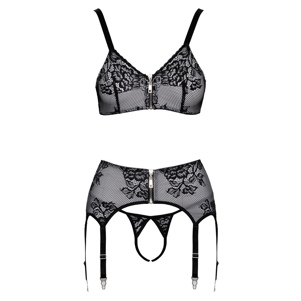 Sujetador suave, liguero y conjunto de tanga sin entrepierna de Cottelli LINGERIE. Las tres piezas de lencería son negras con la parte delantera blanca cubierta de fina encaje negro. El material suave y elástico las hace muy cómodas de llevar. Los detalles en metal plateado completan el elegante look. El sujetador y el liguero tienen un cierre de cremallera en la parte delantera y un gancho en la parte trasera. Los tirantes y las 6 tiras del liguero son ajustables. El tanga seduce con su entrepierna completamente expuesta.