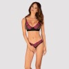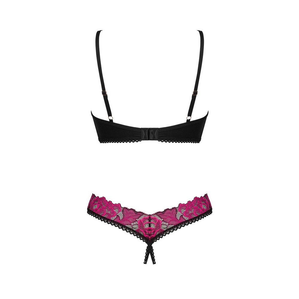 Conjunto Rosenty, de Obsessive, compuesto por sujetador con aros y tanga sin entrepierna. Suave tejido negro combinado con fino encaje rosa, creando una elegante mezcla con tejido elástico opaco. El sujetador presenta un delicado elemento decorativo entre las copas, armazón y cierre de gancho ajustable en la espalda, mientras que los tirantes son regulables para un ajuste perfecto. El tanga seduce con su cintura de encaje y su provocativa abertura en la entrepierna.