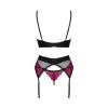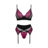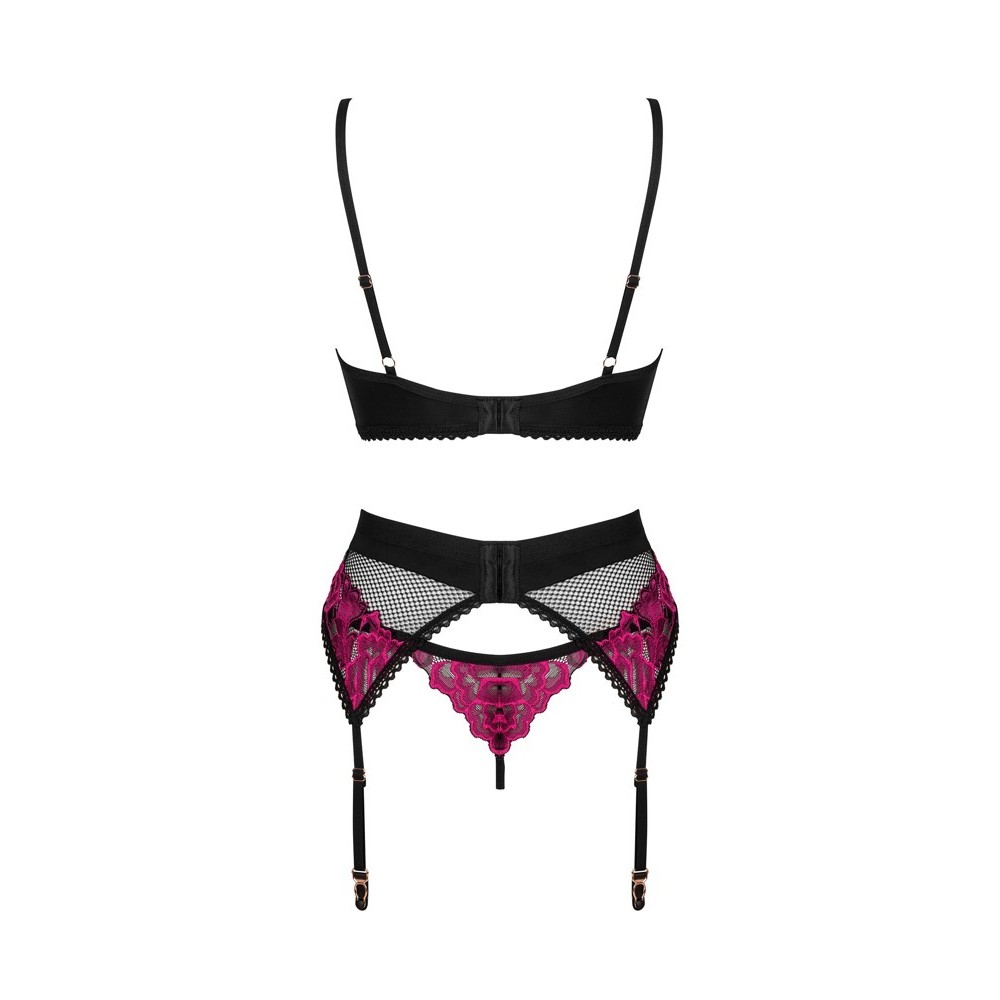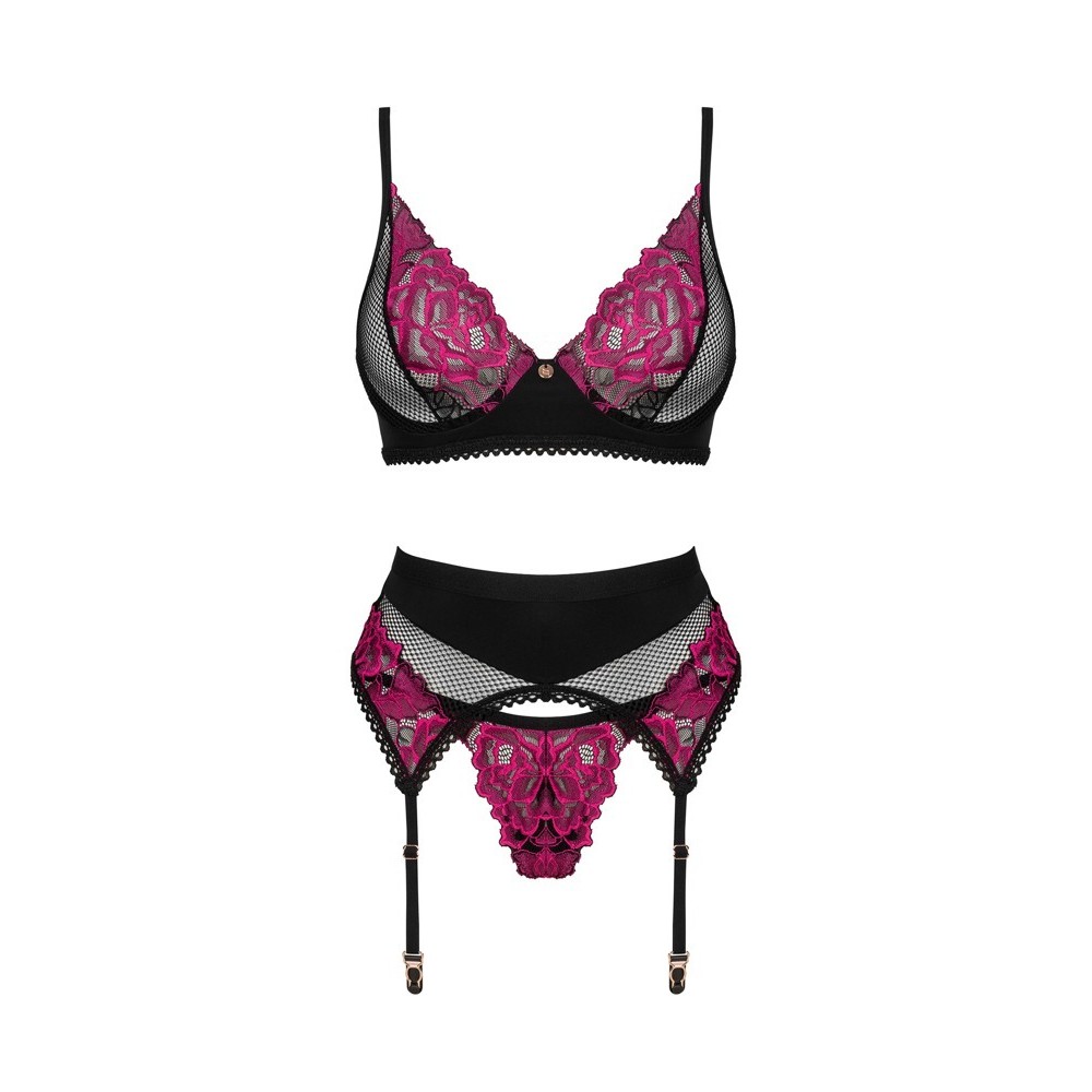 Conjunto de tres piezas Rosenty, de Obsessive, compuesto por sujetador con aros, liguero y tanga. Tejido negro suave combinado con fino encaje rosa, creando una elegante mezcla con tejido elástico opaco. El sujetador presenta un delicado elemento decorativo entre las copas, aros y cierre de gancho ajustable en la espalda, con tirantes regulables para un ajuste perfecto. Los tirantes del liguero y el cierre de gancho del cinturón también son ajustables para un ajuste personalizado.