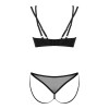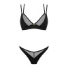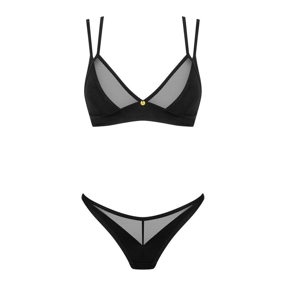 Material elástico opaco en una elegante mezcla con malla elástica suave. Sujetador con un elemento decorativo entre las copas y cierre de gancho ajustable en la parte trasera. Los tirantes cruzados de forma inteligente también se pueden ajustar a medida. El tanga seduce con inserciones de malla y tiras adicionales sobre el trasero.