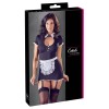 Vestido ajustado con ligas ajustables y removibles, escote redondo, cuello decorativo y encaje con volantes en las mangas y el dobladillo. Incluye delantal para completar el look sensual. Sin medias.