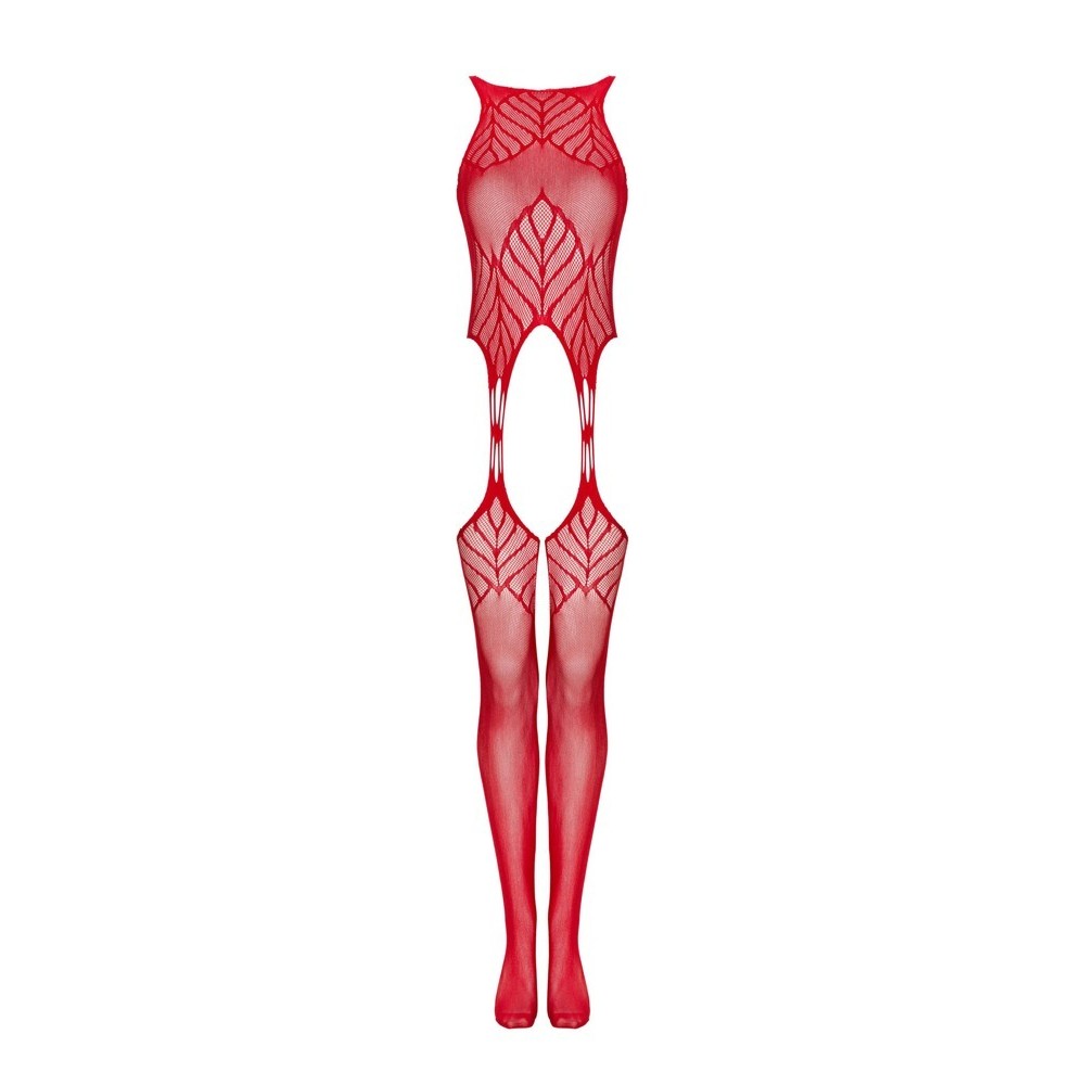 El catsuit N122 en rojo intenso está confeccionado en tejido elástico de alta calidad, que envuelve el cuerpo y realza cada curva. El top está unido a las medias mediante finas tiras, creando un efecto visual atrevido, mientras que el estampado geométrico y el corte redondo en la espalda añaden un toque moderno e irresistible.