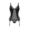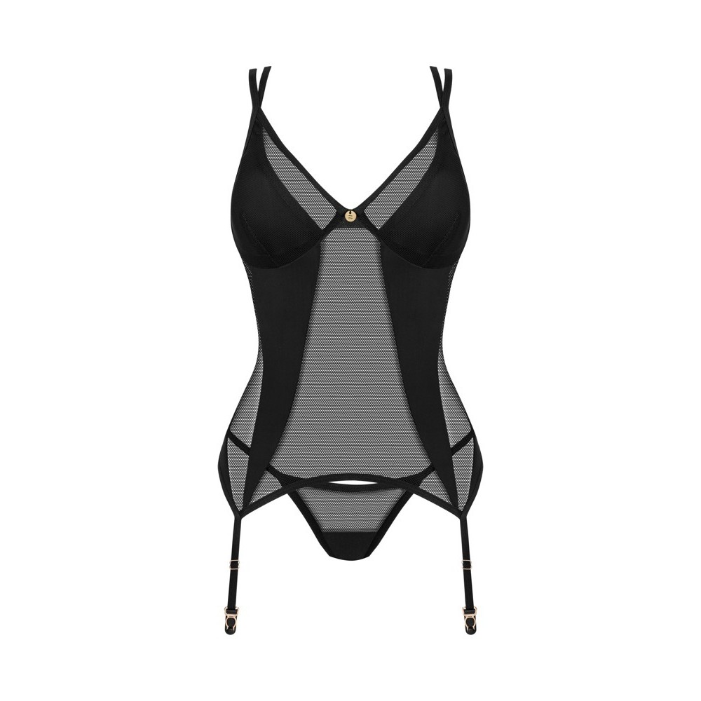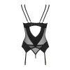 El conjunto Nesari negro de Obsessive incluye un corsé con copas de malla elástica suave combinadas con detalles opacos y pequeños elementos de joyería entre las copas con aros. Cierre de gancho ajustable en la espalda, tirantes cruzados dobles y tirantes ajustables para un ajuste perfecto. El tanga opaco completa el conjunto con elegancia y comodidad.