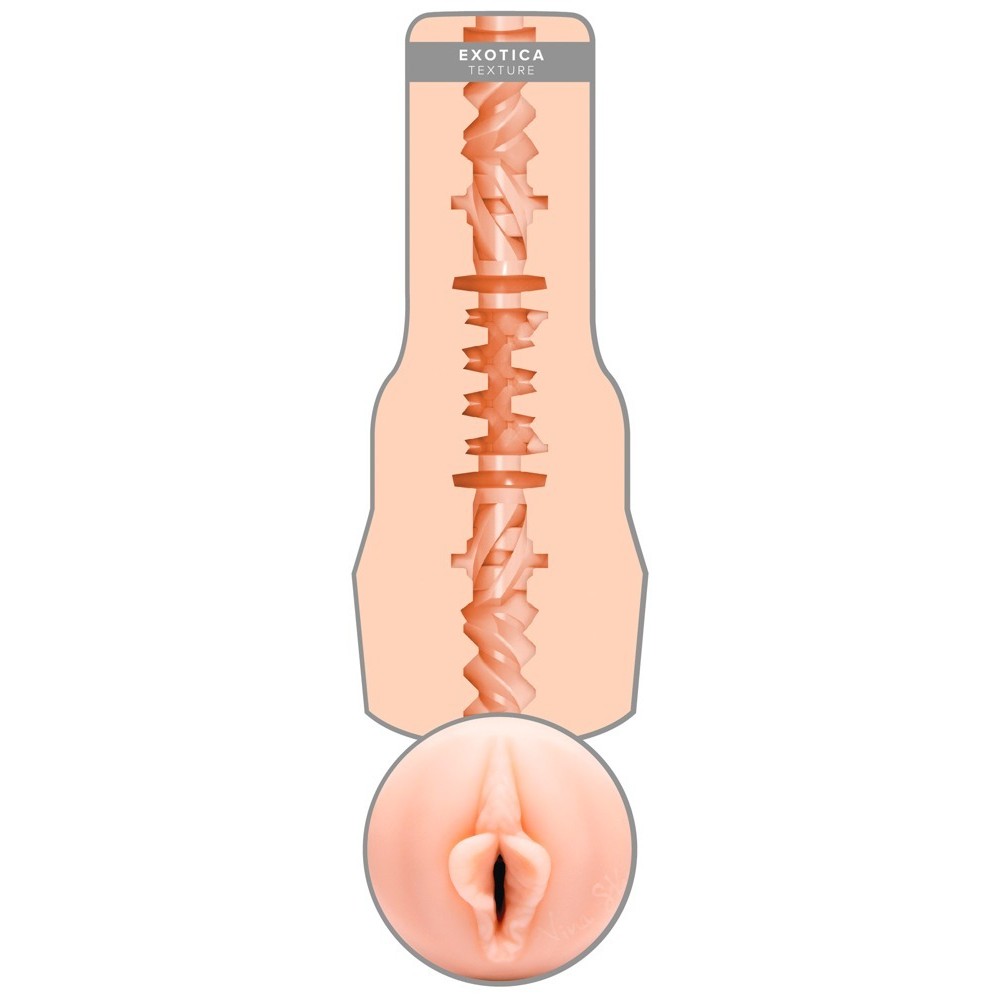 Masturbador con abertura vaginal, presentado en un elegante estuche blanco perla. Incluye una réplica realista de las partes íntimas de la estrella erótica Vina Sky Exotica. El interior del túnel del placer combina puntos, nervaduras y ranuras de diferentes dimensiones para una estimulación intensa y variada. Con tapa protectora y firma de la estrella junto a la abertura. Textura Superskin para una sensación extremadamente realista.