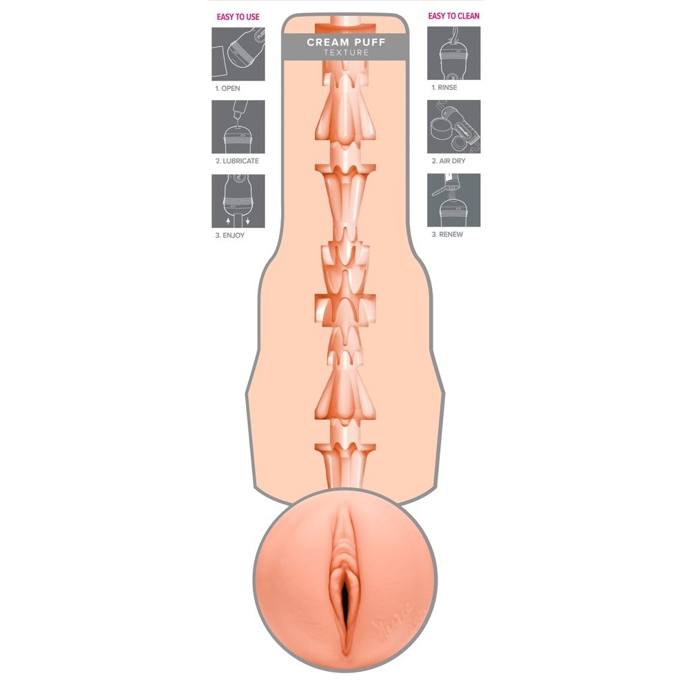Masturbador con abertura vaginal, presentado en un elegante estuche blanco perla. Incluye una réplica realista de las partes íntimas de la estrella erótica Kenzie Reeves Creampuff. El interior del túnel del placer combina puntos, nervaduras y ranuras de diferentes dimensiones para una estimulación intensa y variada. Con tapa protectora y firma de la estrella junto a la abertura. Textura Superskin para una sensación extremadamente realista.