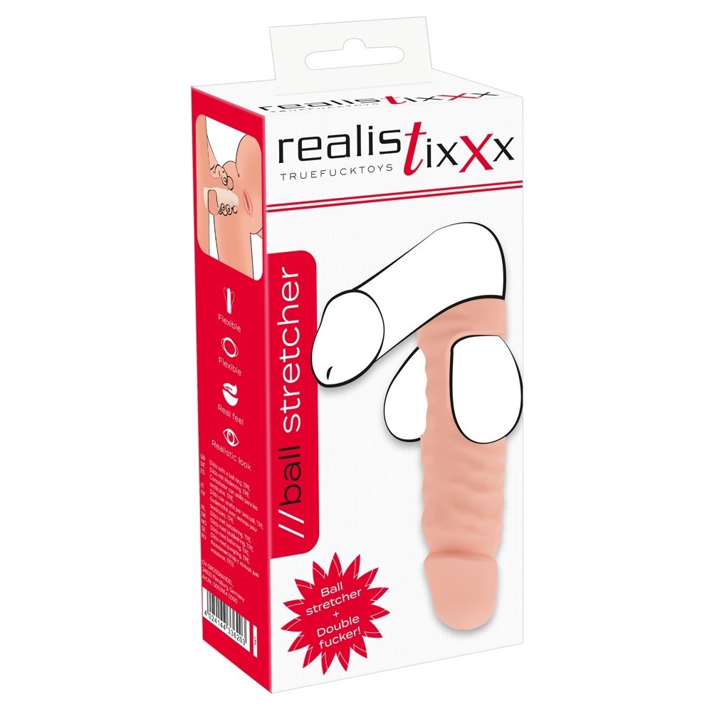 El Ball Stretcher de Realistixxx incluye un consolador, proporcionando una segunda estimulación para experiencias más intensas. Este ingenioso strap-on se coloca pasando el anillo ancho por debajo de los testículos (preferiblemente depilados) hasta la base del pene, y luego se tiran de los testículos a través de las aberturas laterales.